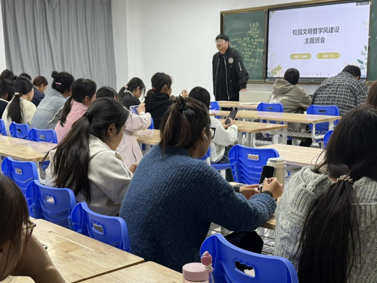 11月3日晚,国际商学院在2025级晚自习教室开展了“校园文明暨学风建设”主题班会。学院学生办公室主任杜相锋,辅导员吕林峰、葛轩琪围绕“立德、立学、立行”,为新生指引大学成长方向。