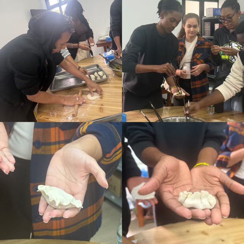 包饺子这一极具中国特色的活动,将全天的体验推向了高潮。起初的笨拙并未削减留学生们的热情,在国际学院老师的点拨下,他们迅速掌握了要领,并自然地分工协作起来:擀皮、备料、包捏,各个环节有条不紊。大家兴致盎然,在这堂生动的“美食实践课”里,感受着中华饮食文化的深厚底蕴。值得一提的是,馅料中的韭菜和大葱正来自他们刚才参观的生态基地,实现了“从田间到餐桌”的零距离体验。当一个个凝结着心意的饺子出锅,大家品尝着自己的劳动成果,脸上洋溢着满足的笑容。这鲜美滋味,不仅是对味蕾的犒赏,更是对中国文化一次亲切而深刻的体验。