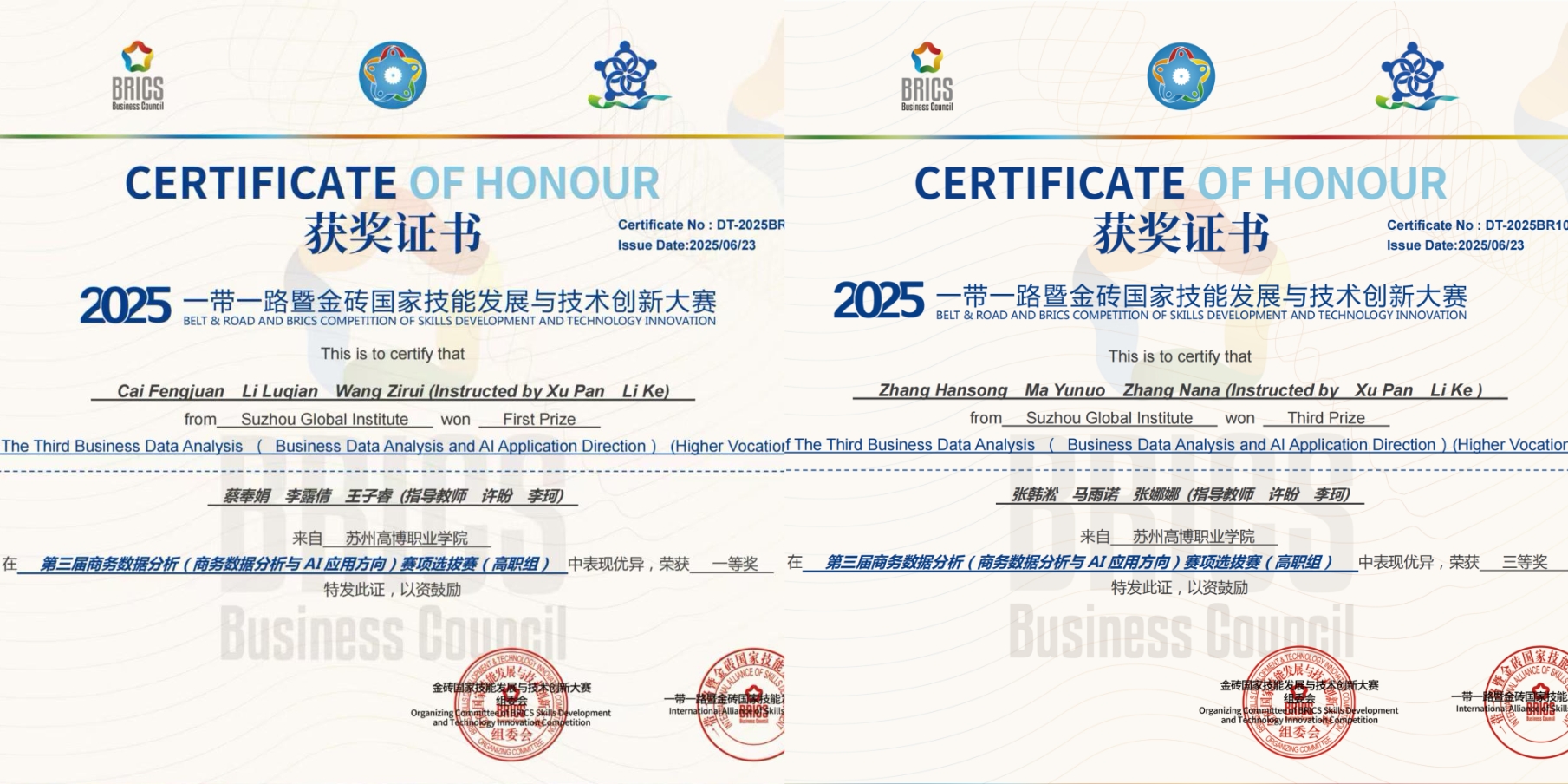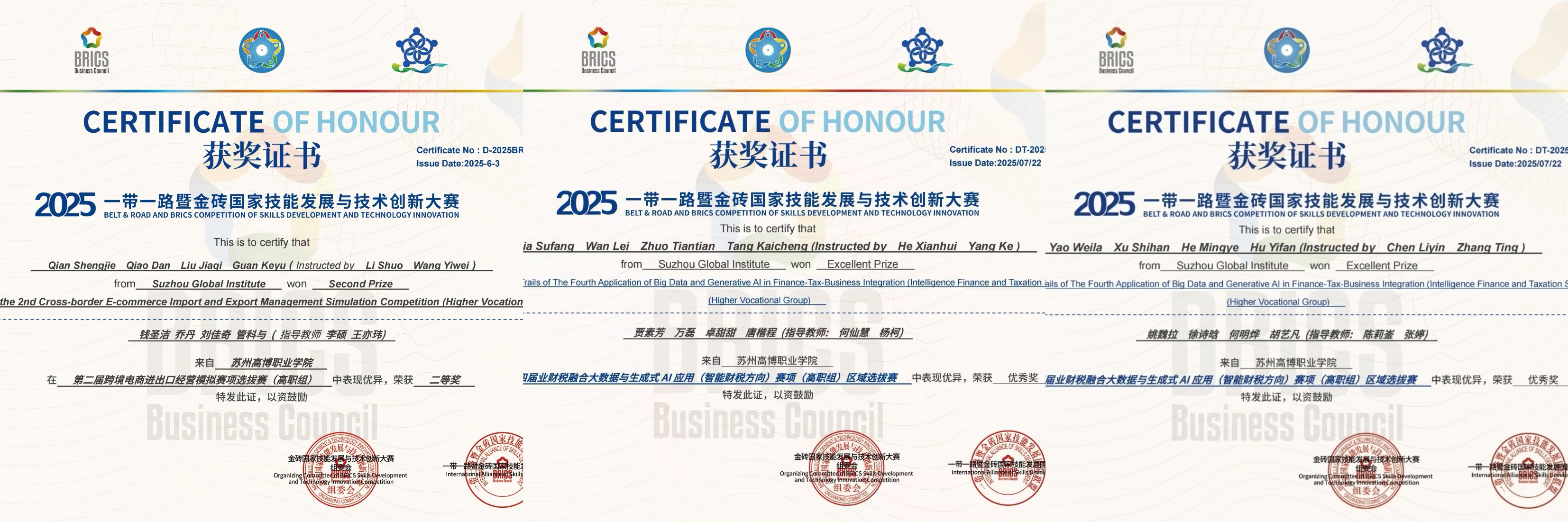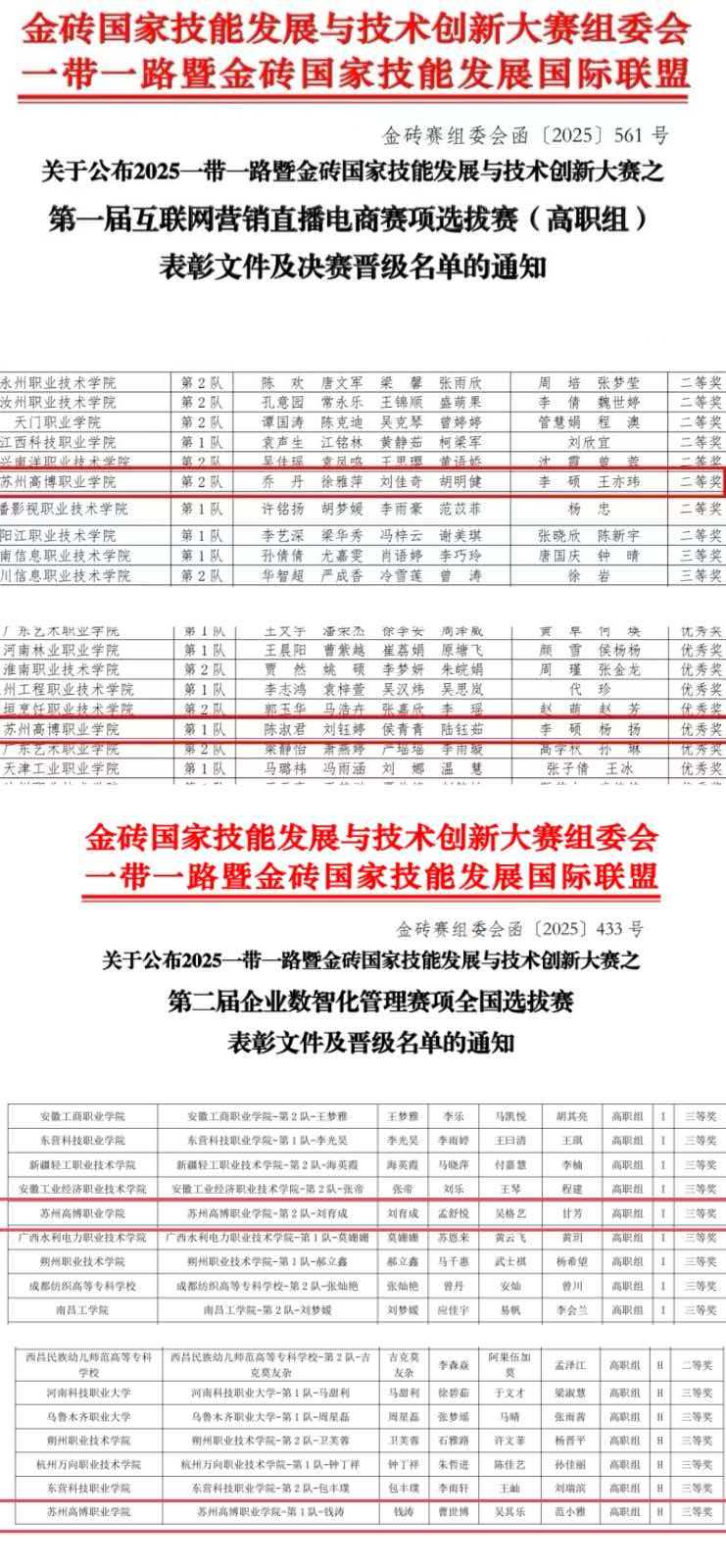 近日,“2025年一带一路暨金砖国家技能发展与技术创新大赛”各大赛项成绩相继揭晓。经过前期的精心遴选和学院领导的统筹组织,beat365官网国际商学院共选派队伍参加了7个赛项的角逐,学院学子凭借扎实的专业技能、出色的创新能力和稳定的临场发挥,在比赛中脱颖而出,共斩获一等奖1项、二等奖3项、三等奖5项、优秀奖3项,累计参赛达44人次,创下学院参与本项赛事的历史最好成绩,展现了在高素质技术技能人才培养方面的显著成效。