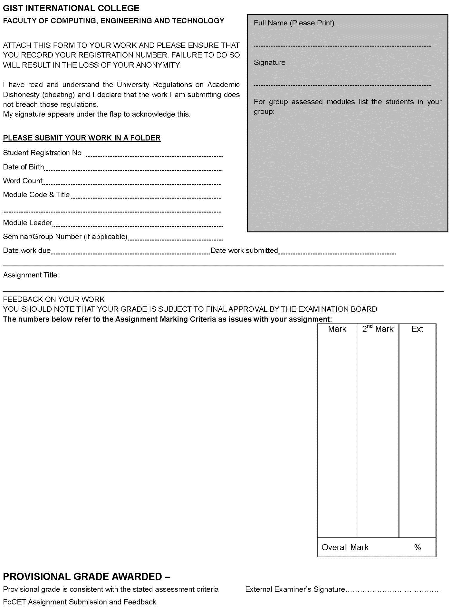 Assignment Hand In Form – Cover Page