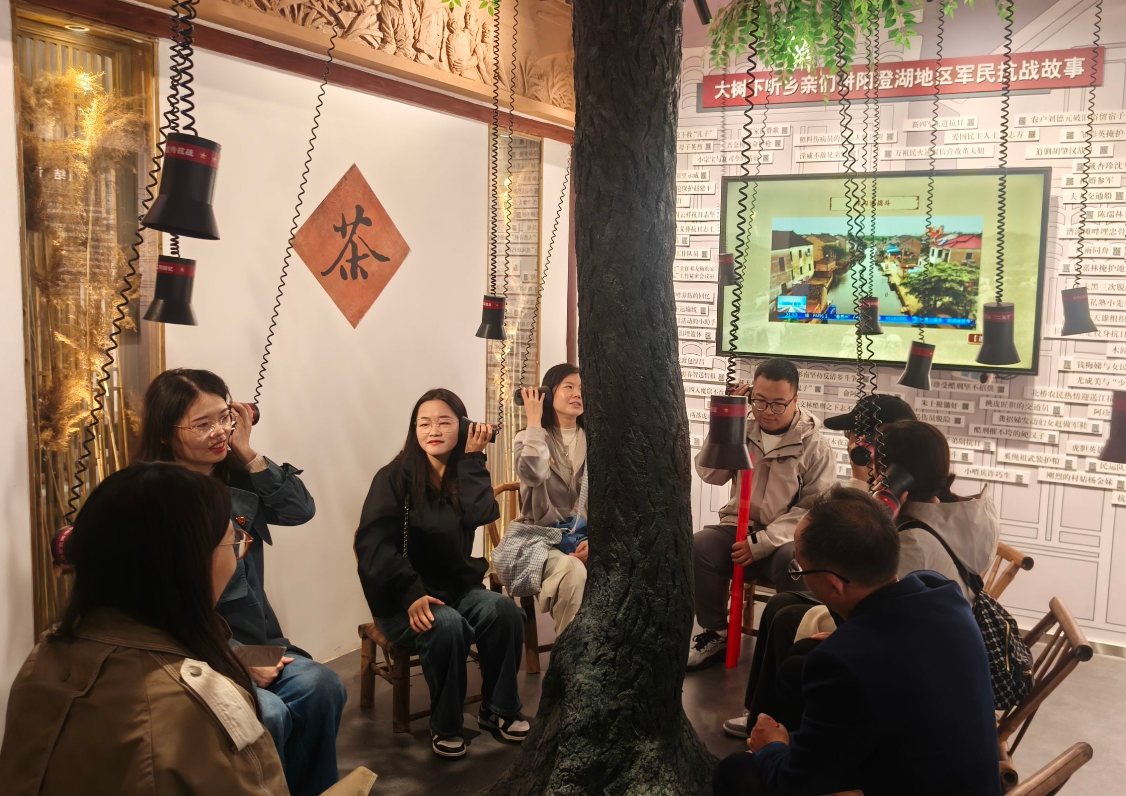 在复原的“沺泾茶馆”场景前,党员们驻足良久。透过栩栩如生的人物蜡像与讲解员的介绍,“阿庆嫂”原型陆佩娟以茶馆为掩护,巧妙传递情报、护送革命同志的故事鲜活地呈现在眼前——她如何在日军搜查时镇定地将密信藏入茶壶,如何借着“添茶”的机会向游击队员传递敌军动向,一个个细节让大家深刻体会到战争年代里,普通民众用智慧与勇气筑起的 “隐形防线”。而在“大树下听故事”互动区域,“村民深夜冒雨为游击队送粮食”、“儿童团员站岗放哨查路条”等真实故事通过听筒缓缓展开,那些平凡人身上的家国情怀,让“江山就是人民,人民就是江山”的内涵变得愈发具体而深刻。同时,馆内还通过复原“沈菊英带领妇委会妇女制作棉衣”场景,展现了革命战争年代党和人民风雨同舟、血脉相连的紧密关系。这些真实的历史场景让全体党员深刻认识到,人民群众的衷心拥护和支持是我们党执政兴国的坚固基石,是党的事业不断从胜利走向胜利的力量源泉。