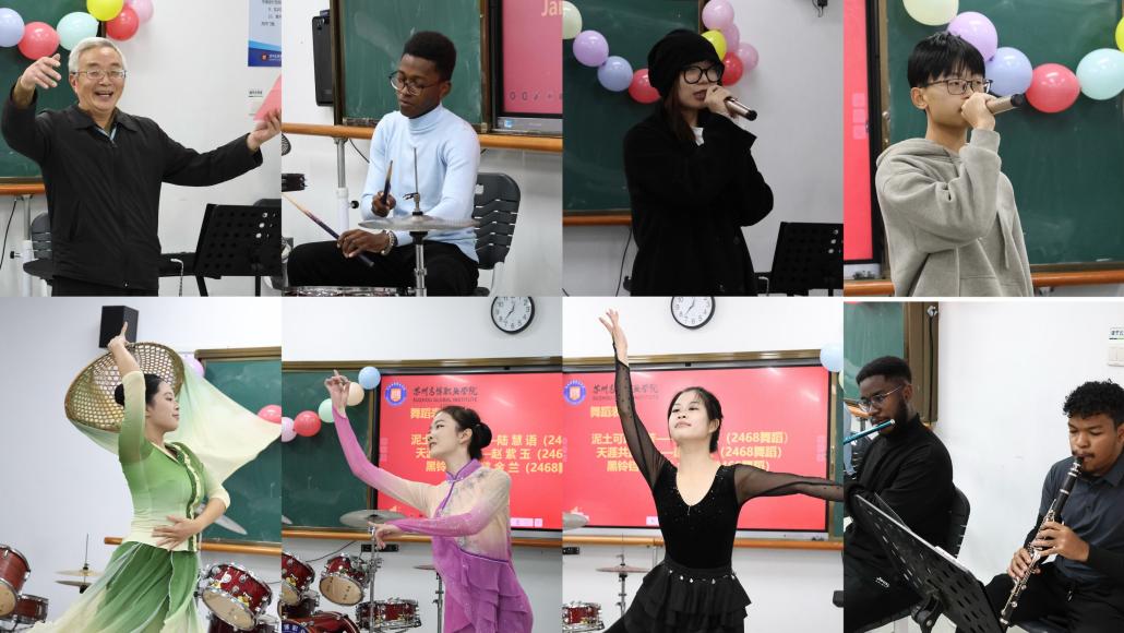 随后,中外师生联袂呈现了一场精彩纷呈的文艺演出。洪庆福教授深情演唱《草原上升起不落的太阳》,刘佳同学带来活力四溢的英文歌曲Number One Girl,王晟焯同学演绎日文金曲《打上花火》,留学生代表Jarad、Daniel和Aidan以乐器联奏Perfect,Don’t Stop Believing奏响跨越文化的和声。舞蹈表演班的陆慧语、赵紫玉和黄金兰同学则以《泥土可以芬芳》《天涯共此时》《黑铃铛》舞蹈串烧点燃全场氛围,展现出青年学子的蓬勃朝气。