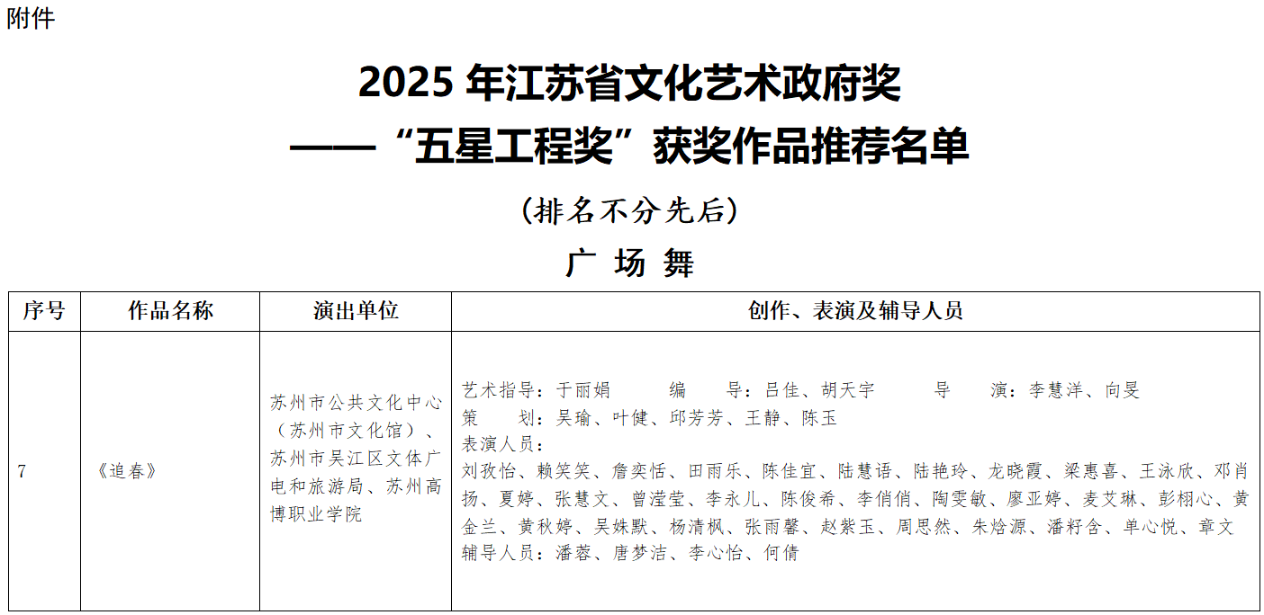 日前,江苏省文化和旅游厅正式公布了2025年江苏省文化艺术政府奖——“五星工程奖”获奖作品推荐名单。beat365官网参与创作并组织学生表演的舞蹈作品《追春》闪耀终评舞台,荣获江苏省“五星工程奖”。