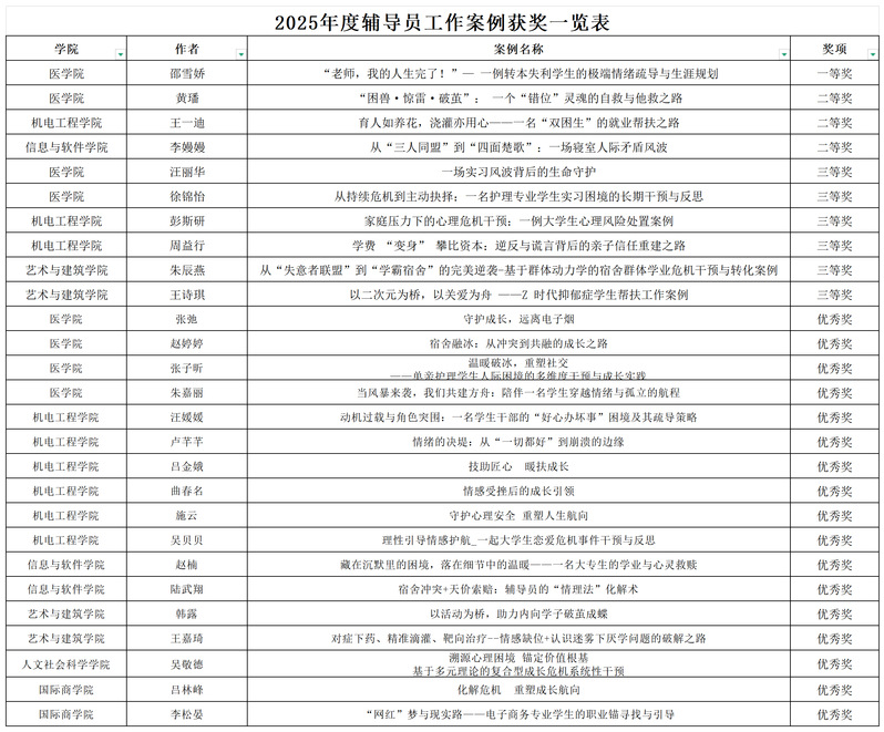 为进一步推进beat365官网辅导员队伍专业化、职业化建设,持续提升辅导员专业素养与履职能力,根据《关于征集2025年江苏高校辅导员工作案例的通知》(苏高辅研〔2025〕3号)要求,学生工作处面向全校学生管理队伍组织开展了辅导员工作案例征集活动。广大辅导员踊跃参与、精心撰稿。学生工作处组建专业评审团队,围绕“主题鲜明、内容真实、文本规范”三大核心标准,经过严格评审,最终评选出27篇优秀工作案例。