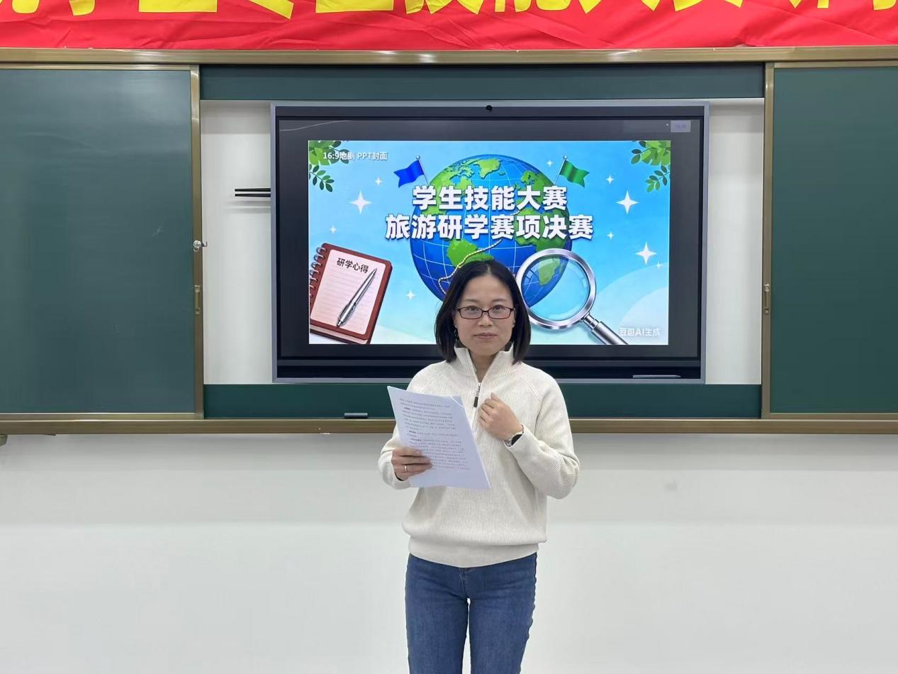 颁奖结束后,本次赛事核心评委代表依次登台发表总结致辞,为赛事画上圆满句号。国际商学院副院长牛伟在致辞中肯定了本次赛事的育人价值,她表示,选手们的表现充分彰显了旅游专业学子的专业潜力与青春风采,赛事搭建的 “学练赛” 平台,有效推动了理论知识与实践技能的深度融合,为专业人才培养提供了有力支撑;社会服务系主任罗正英聚焦专业建设,强调赛事为 “以赛促教、以赛促改” 提供了鲜活样本,系部将以赛事为抓手,持续优化课程体系与教学模式,让教学内容更贴合行业需求。