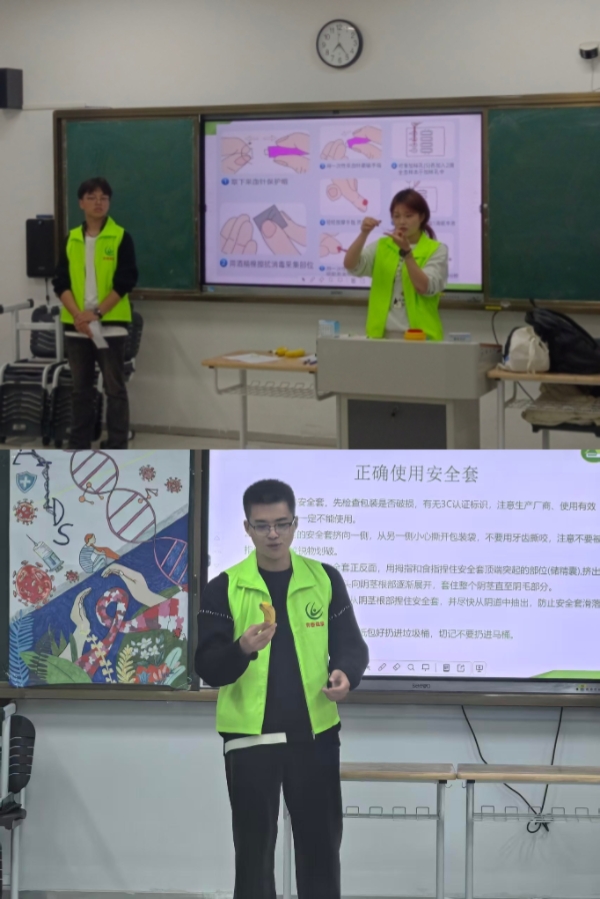 在知识传递的同时,活动注重实用技能培养,现场演示了HIV自检试剂的正确使用方法及安全套的科学使用步骤,帮助同学们掌握切实可行的防护手段。