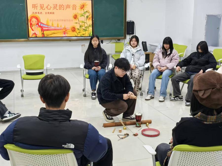 活动经过一周多的精心筹备与全校范围宣传,通过宿舍楼下海报等多渠道招募成员,旨在探索音乐与心理健康的深层联结。晚上六点,活动在马老师的引导下正式开始。不同于传统心理讲座,现场摆放了多种乐器,营造出轻松而充满创造力的氛围。