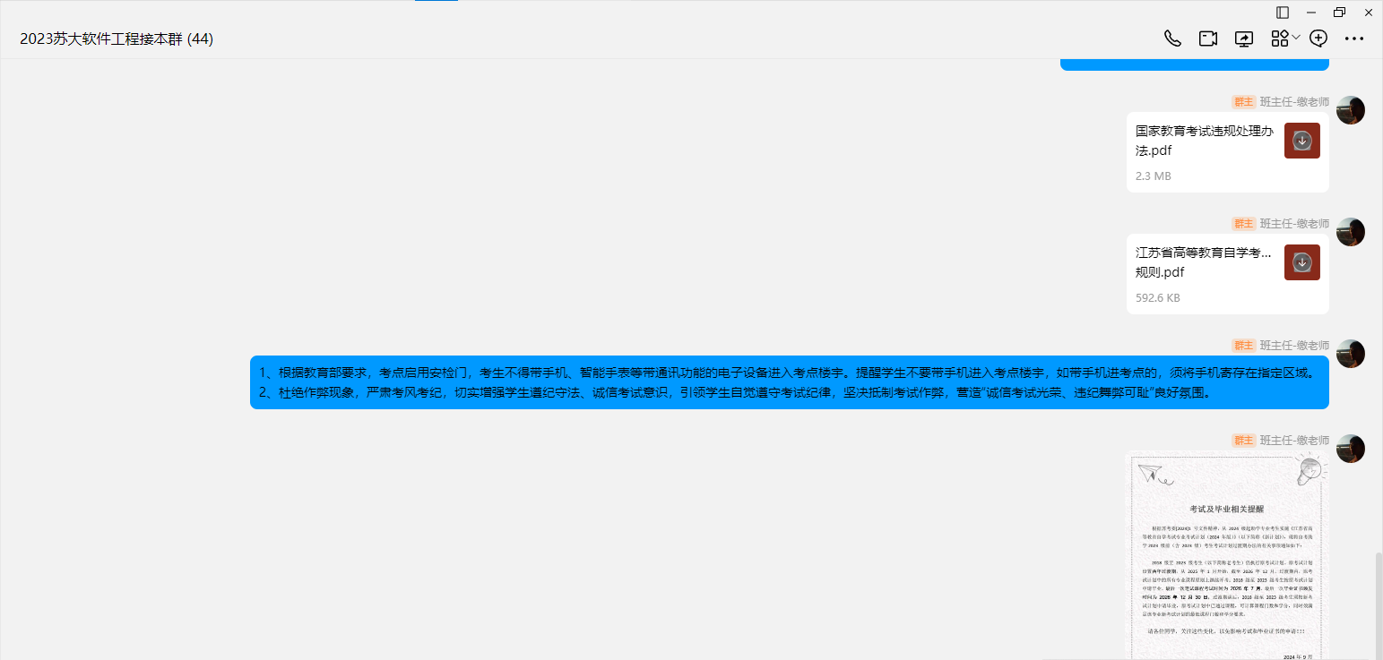此外,学院还特别组织往届未毕业学生统一由缴艳昆老师通过QQ平台进行线上宣传教育。缴老师针对往届生特点,重点传授备考策略、时间管理技巧以及诚信应考的具体要求,帮助同学们缓解考试压力,增强备考信心。线上宣传形式灵活便捷,覆盖范围广,进一步增强了诚信教育的针对性和实效性,得到了往届未毕业学生的积极响应。