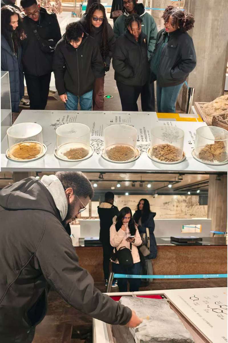 留学生们首先步入主展厅,脚下黄泥铺地,瞬间将人引入历史现场。展厅以时间为轴,清晰勾勒出金砖从“开物”(取土炼泥)、“成器”(制坯烧窑)到“致用”(运输应用)的完整生命轨迹。留学生们在层层递进的观展中,深刻理解了阳澄湖畔普通的黄泥粘土,如何经过数十道繁复苛刻的工序,历经漫长窑火淬炼,最终蜕变为质地坚硬、敲之铿然有声的“金砖”。不少学生忍不住俯身,以手轻叩展出的金砖实物,聆听那穿越数百年的清越回响,赞叹不已。