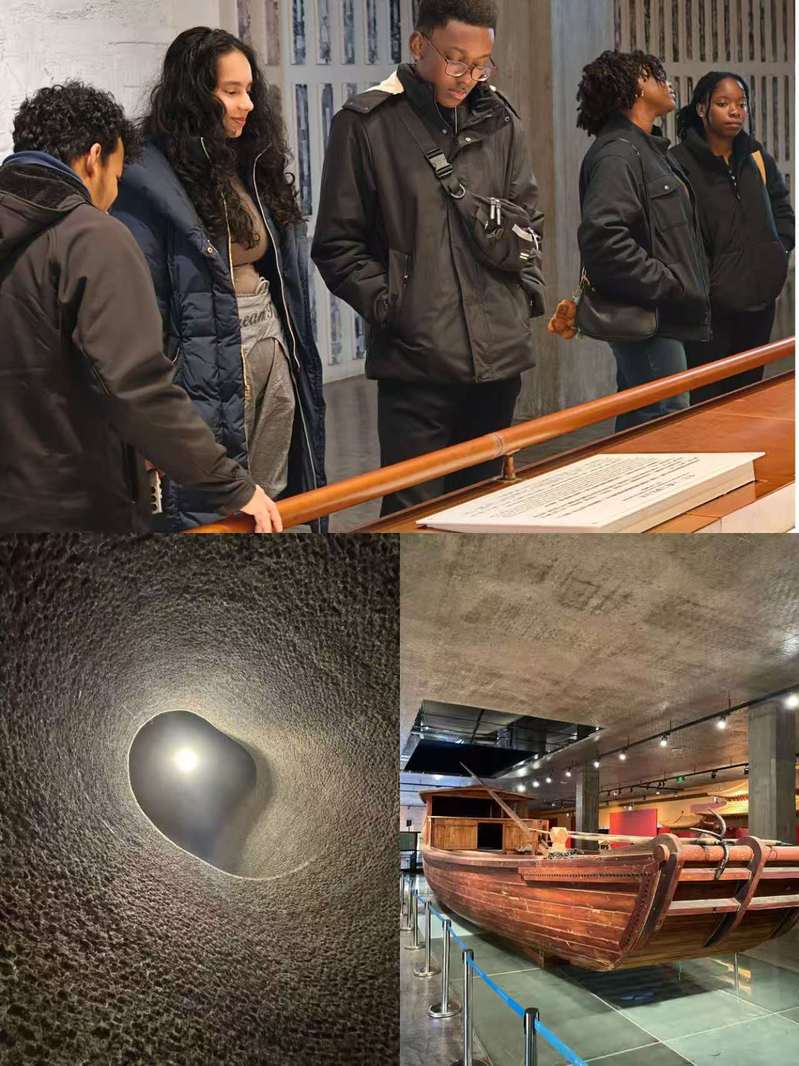 移步第二展厅,一艘巨大的漕船模型赫然在目,瞬间将空间的叙事从苏州相城的窑场拉向了千里之外的北京城。这里生动再现了金砖通过京杭大运河这一古代交通命脉,漕运北上的壮观场景。留学生们沿着展线,仿佛亲历了金砖作为“钦工物料”的空间大转移,感受着中国古代庞大的物流组织与国家工程的力量。在模拟窑洞的体验区,大家深入其中,感受窑内空间的尺度与结构,对金砖烧造所需的环境与控制有了更直观的认识。
