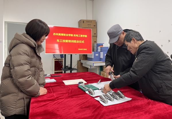 张茂青副院长指出,本次培训结合教师教学实际需求设计培训内容,涵盖普通车床结构原理、安全操作规程、刀具选择与安装、工件装夹技巧、车削工艺编制及轴类零件加工等核心模块。感谢大家培训秉持“勤学精进、学以致用”的态度,全身心投入学习,按照培训要求完成任务,后期要把培训所学的技能与工艺方法融入课堂教学,优化实训教学环节,更好地指导学生提升实操能力。随后,为大家颁发培训结业证书。