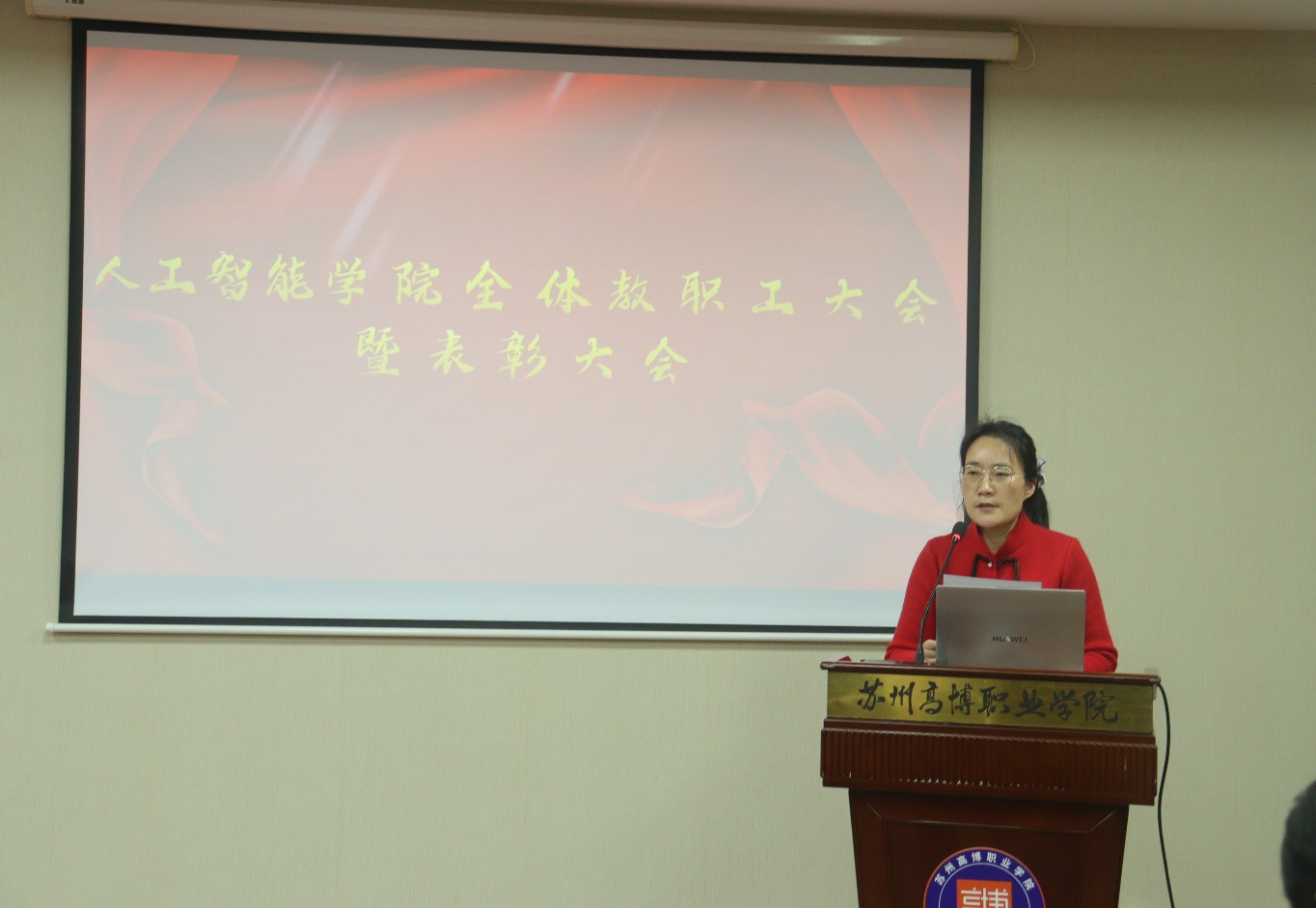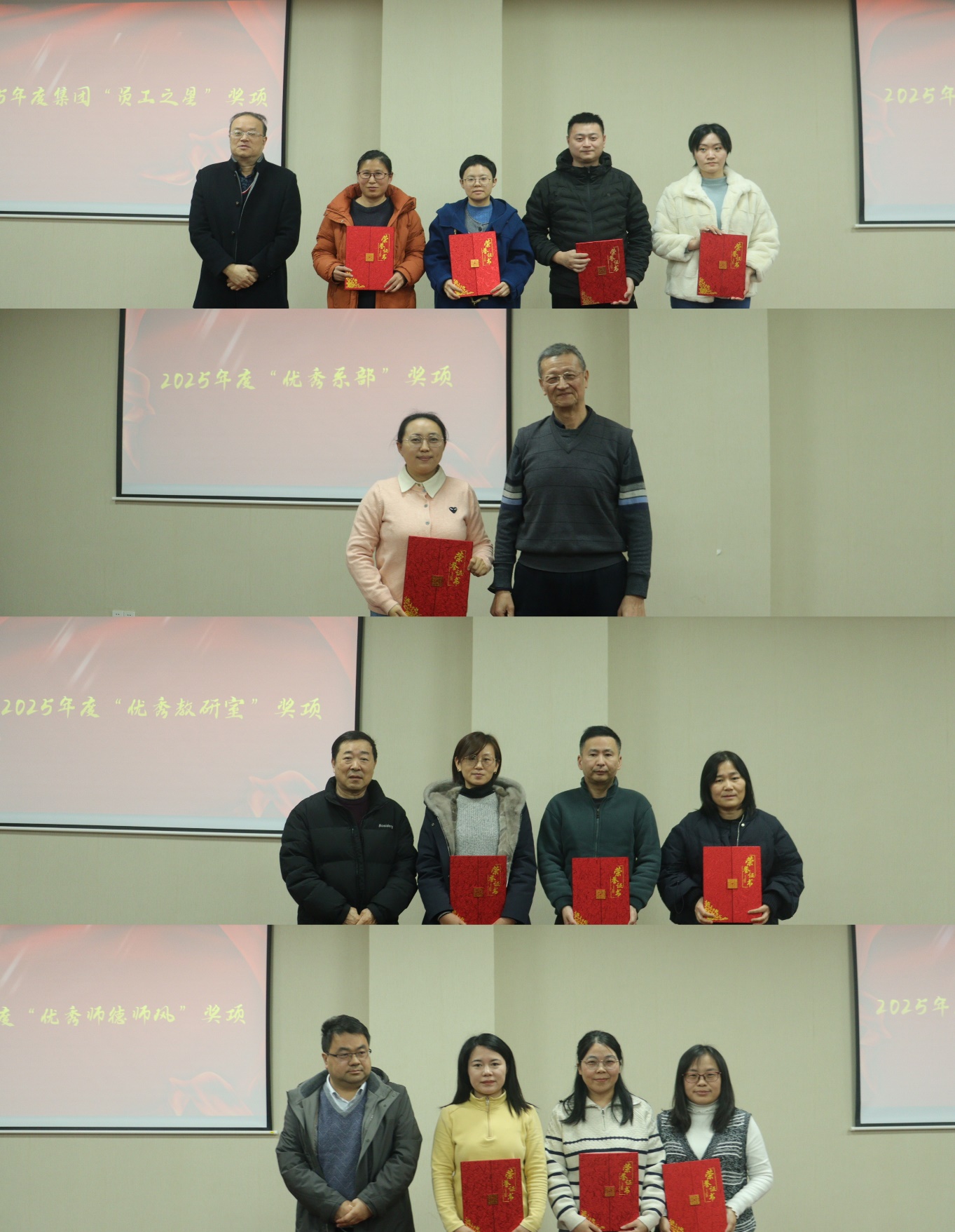 随后进入表彰环节,大会对2025年度表现突出的集体与个人进行隆重表彰。学校副校长、学院党总支书记周肖兴为集团“员工之星”黄冬丽、徐怡、赵志敏、马介莉颁奖;院长孙涌为优秀系部(人工智能系)代表秦晓燕颁奖;副院长张书奎为优秀教研室代表陶晓青(实训教研室)、瞿梦菊(软件技术教研室)、李梅(计算机网络技术教研室)颁奖;副院长、副书记郑兰松为师德师风优秀个人王莹莹、王咏梅、李嫚嫚颁奖。全体参会人员以热烈掌声向获奖集体和个人表示祝贺,致敬他们在各自岗位上的辛勤付出与卓越贡献。