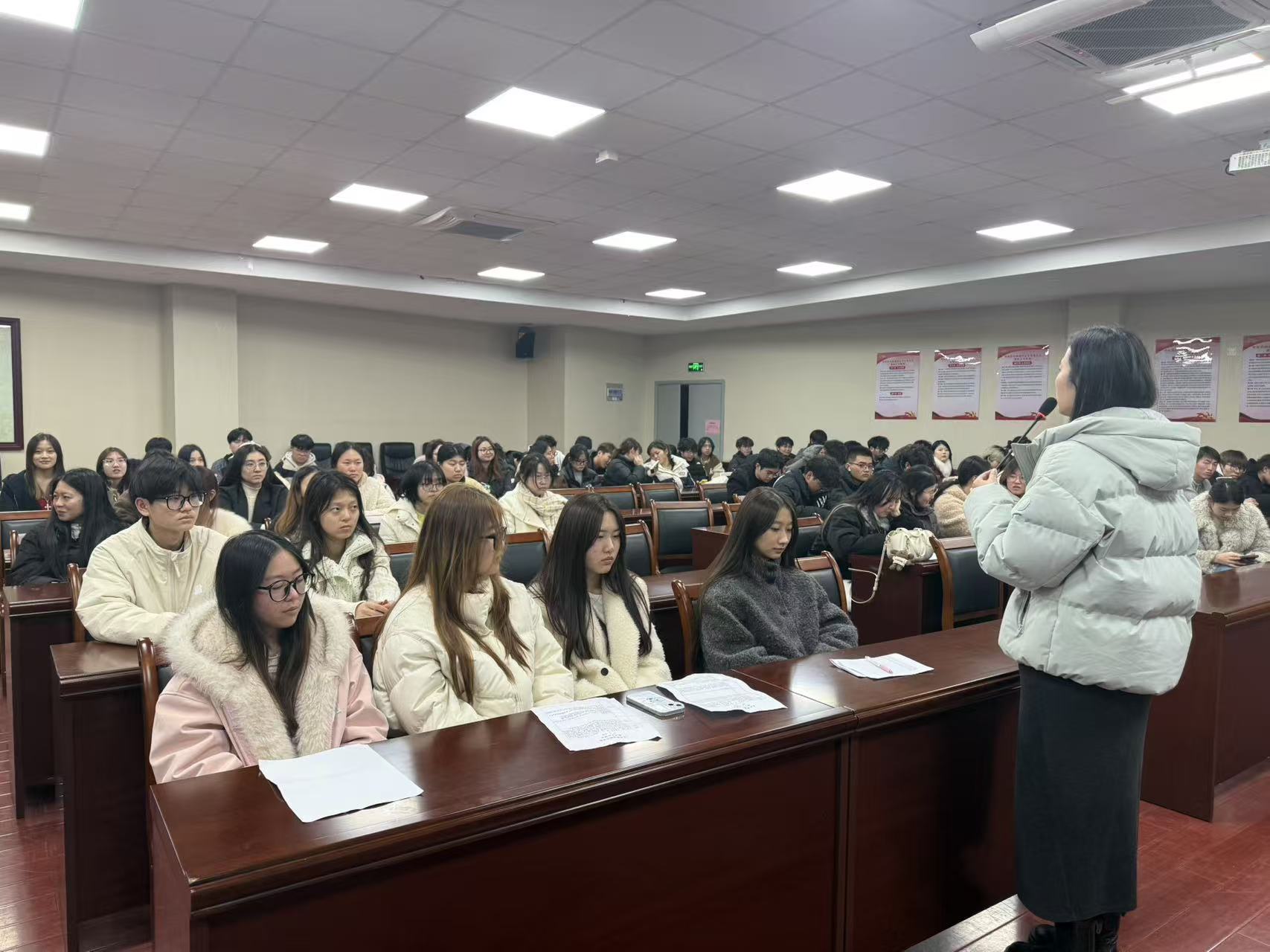 防诈骗教育环节,赵老师用“刷单=诈骗”“裸聊=敲诈”“熟人借钱=核实”“客服退款=钓鱼”四个公式总结常见骗术,提醒大家正规兼职不会先收钱、退费不会通过第三方平台。她现场“灵魂拷问”同学们是否下载国家反诈中心APP并开启预警,呼吁大家用好“防骗神器”,守住钱袋子。