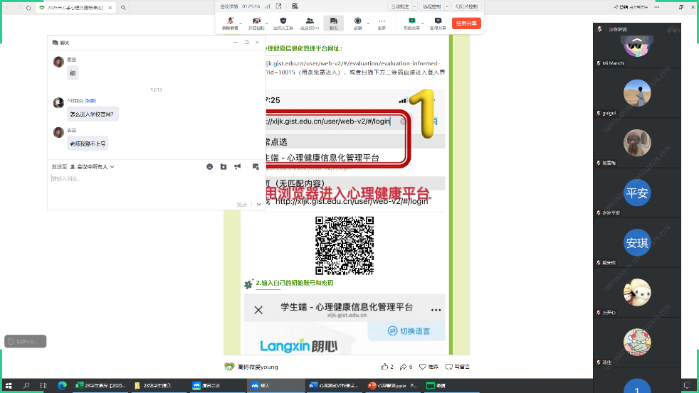 为增强宣讲效果,切实解决学生的实际困难,会议特别设置了在线答疑环节。同学们通过会议聊天区积极提问,就登录时可能出现的网络卡顿、登录信息核对、测评环境要求等具体操作问题进行了咨询。马俊涛老师对同学们提出的问题给予了耐心、细致的解答,并针对部分同学在登录及平台使用方面遇到的特殊情况进行了一对一的指导,有效扫清了同学们参与普测的障碍。