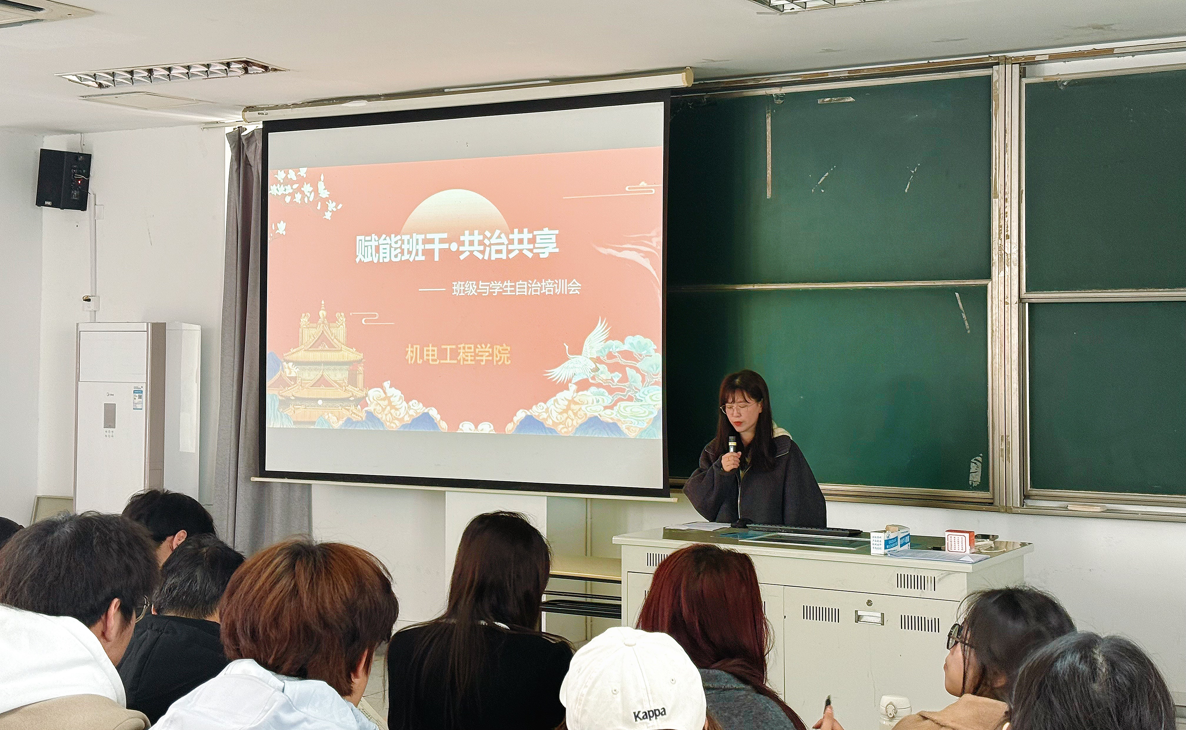为深入贯彻落实立德树人根本任务,进一步提升学生干部的综合素质与班级治理能力,打造一支“服务型、管理型、示范型”的班干部队伍,2026年3月19日,机电工程学院在12-508教室成功举办了“赋能班干·共治共享”班级与学生自治培训会。机电工程学院党总支副书记、辅导员及全体班级学生干部齐聚一堂,共话班级建设。会议由分团委书记施云老师主持,由学院四位辅导员联袂授课,旨在通过多维度的视角,帮助班干部找准定位、掌握方法、提升效能。