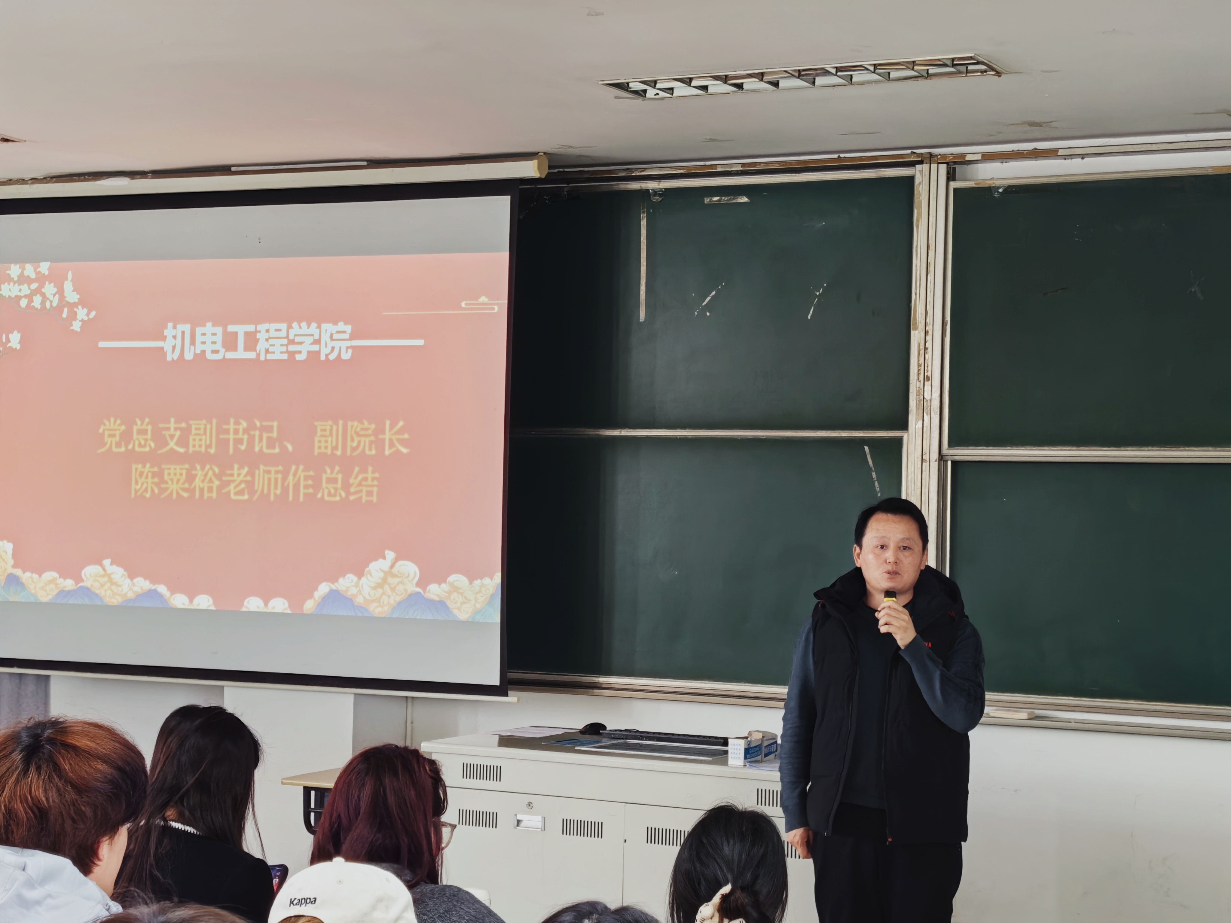 最后,机电工程学院党总支副书记、副院长陈粟裕老师对本次培训进行了总结与寄语。他指出,班干部的首要身份是“学生”,学习永远是第一位的。班干部要在服务同学中提升自我,在协助老师中锻炼能力。学院将始终秉持“赋能”理念,以支持学生自治为基础,构建自治、共治、共享的育人共同体,致力形成各美其美、美人之美、美美与共的生动发展局面。